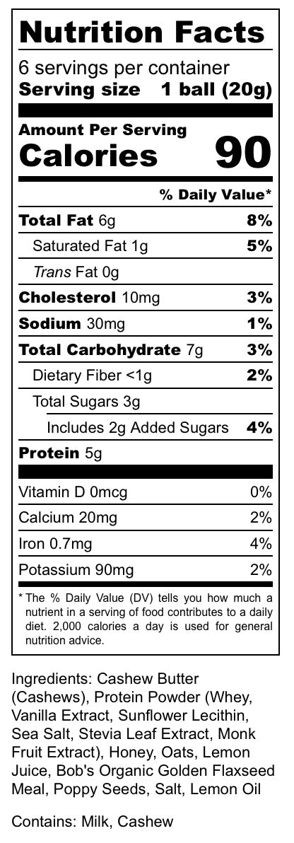 Our Lemon Kiss Bites are crafted with creamy cashew butter, whole oats, golden honey, and a hint of lemon, then finished off with a sprinkle of poppy seeds for that nostalgic bakery-inspired flavor. Minus the guilt.